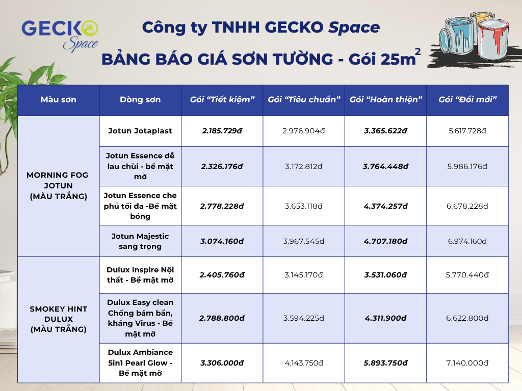 Tại GECKO Space, chúng tôi không áp đặt quy trình cứng nhắc cho tất cả công trình. Thay vào đó, chúng tôi thiết kế 4 gói sơn tường linh hoạt, giúp bạn: